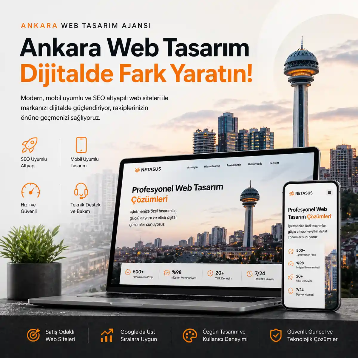 Netasus Web Tasarım olarak Ankara’da faaliyet gösteren işletmelere özel, modern ve kullanıcı odaklı web siteleri geliştiriyoruz. Web sitelerimiz sadece görsel olarak değil, aynı zamanda Google’da üst sıralarda çıkabilecek şekilde teknik olarak optimize edilmektedir.